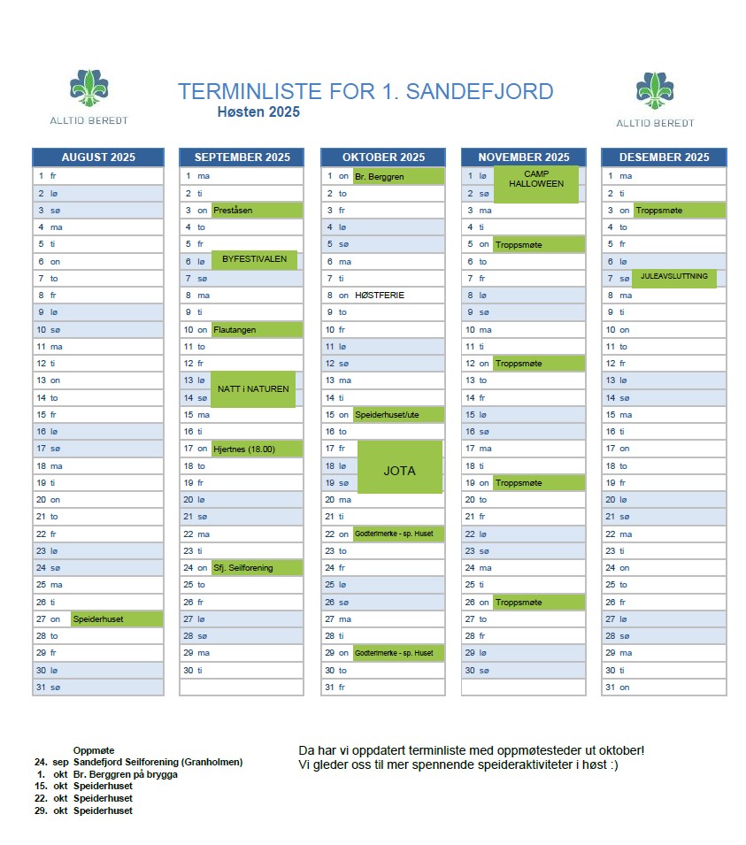 Hei, og velkommen til høsten 2025 i troppen! Her er terminlista for troppen. Den har per nå oppmøtesteder ut oktober. Det vil bli oppdatert en og en måned fremover.